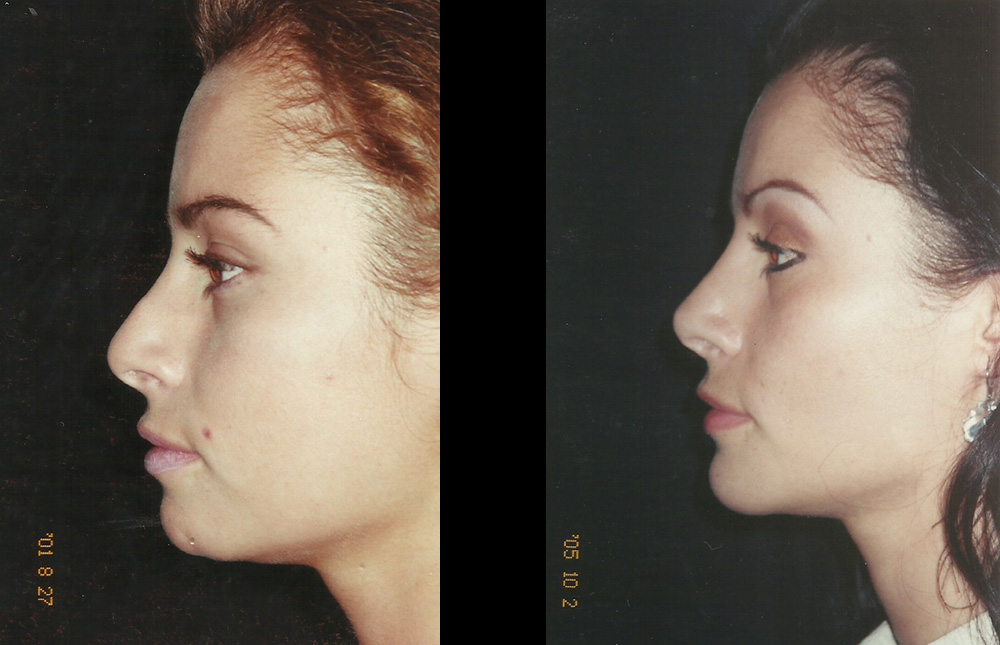 Procedimiento: Cirugía múltiple de cara: Rinoplastia secundaria. Corrección de V invertida con injertos separadores + Aumento de dorso nasal óseo + Proyección y definición de punta nasal + Mentoplastia. Resultado a las 4 años.